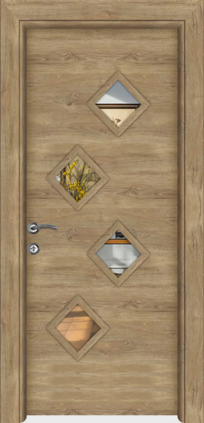 Интериорната врата FR MR 26 е стилно и функционално решение, което съчетава изчистен дизайн и практичност. Вграденото двустранно огледало допринася за визуално разширяване на пространството и прави модела подходящ за коридори, спални и гардеробни помещения.
