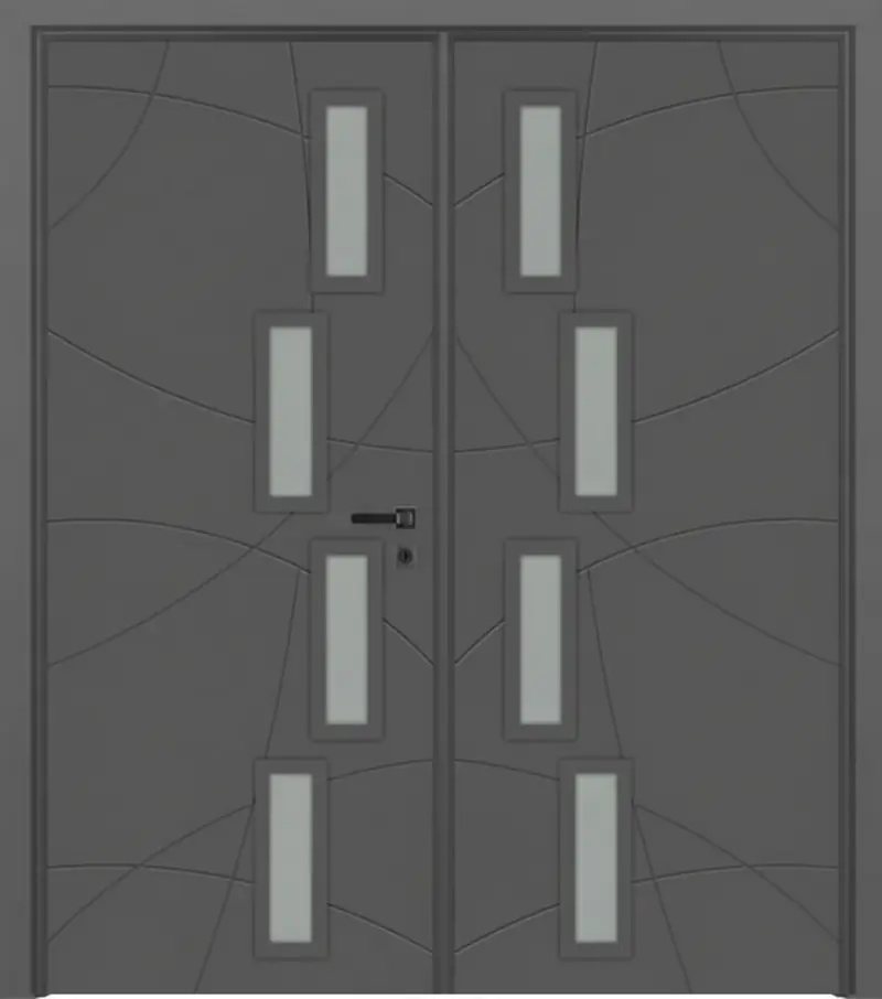 Модел VD-20 впечатлява със своя модерeн геометричен дизайн и изчистени линии, които придават елегантност на всяко интериорно пространство. Вратата съчетава стилни вертикални остъклявания с фина декоративна орнаментика, което я прави подходящ избор за домове, офиси и модерни интериорни решения. Двукрилата конструкция осигурява удобство, простор и висока функционалност, а неутралният графитен цвят позволява лесно комбиниране с различни интериорни стилове.