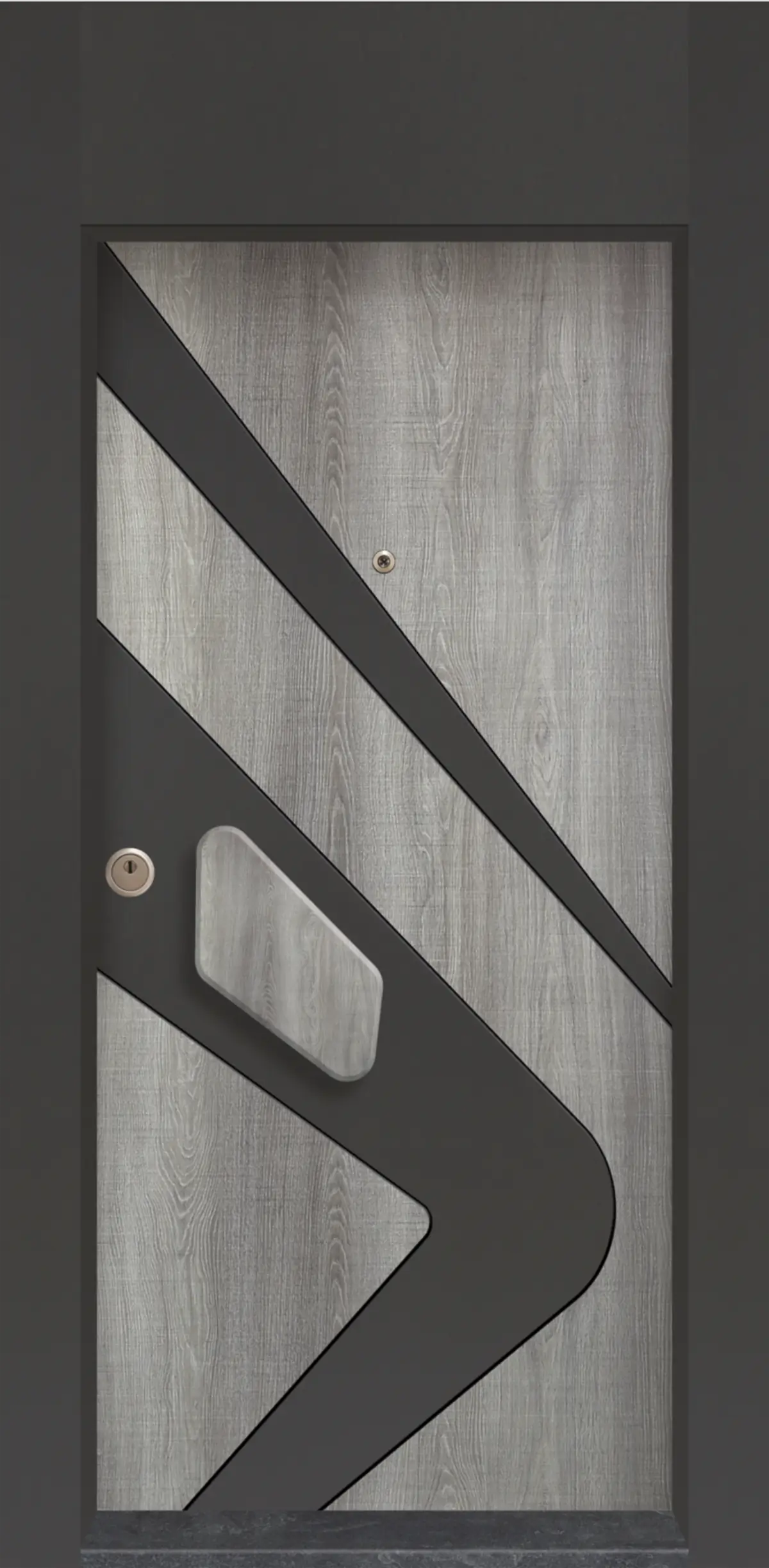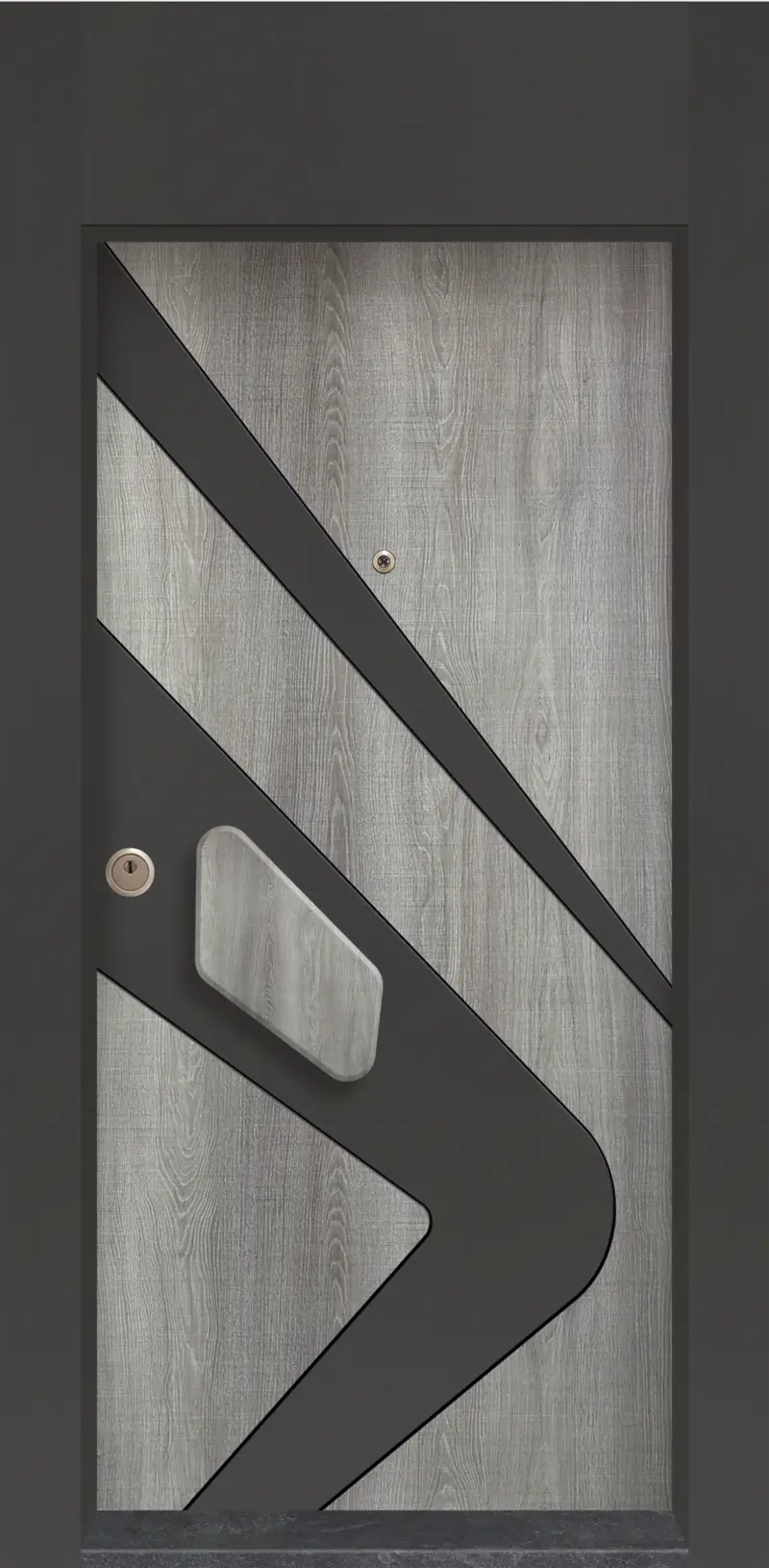 Аманда – Блиндирана Врата е модерно входно решение с изключително впечатляваща визия. Комбинацията от светъл дървесен декор Сиво Меше и смели черни диагонални линии оформя динамична геометрия, придаваща характер и престиж на входа.