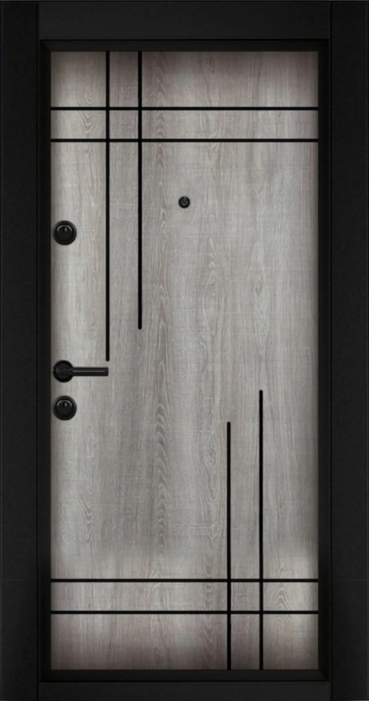 Блиндирана входна врата ST75 Сиво меше – модерна визия с имитация на дърво, тройно заключване и двоен изолационен слой. 1.2 mm метал, каменна вата и регулируема каса за максимална защита и комфорт.