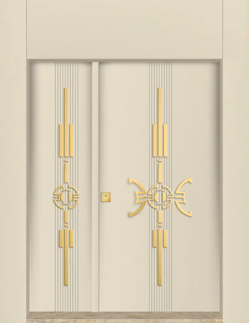 Кремавата основа и деликатните вертикални линии подчертават височината и изтънчената форма на входа, докато златните орнаменти добавят усещане за висок клас и аристократично присъствие.