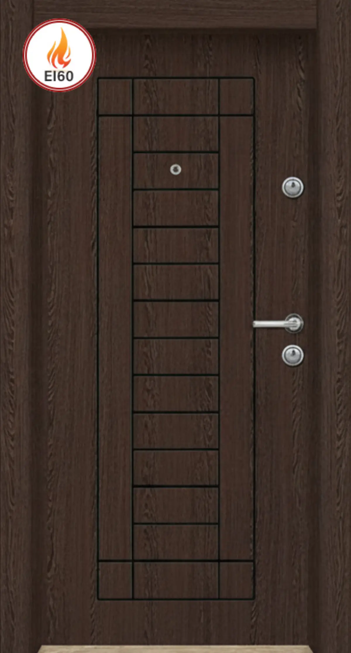 Пожароустойчивата блиндирана врата М09 Венге EI 60 се отличава с елегантен и модерен дизайн в стил Венге, комбиниран с висока здравина и надеждна противопожарна защита. Сертифицирана за 60 минути пожароустойчивост, тя осигурява безопасност както отвън, така и отвътре.