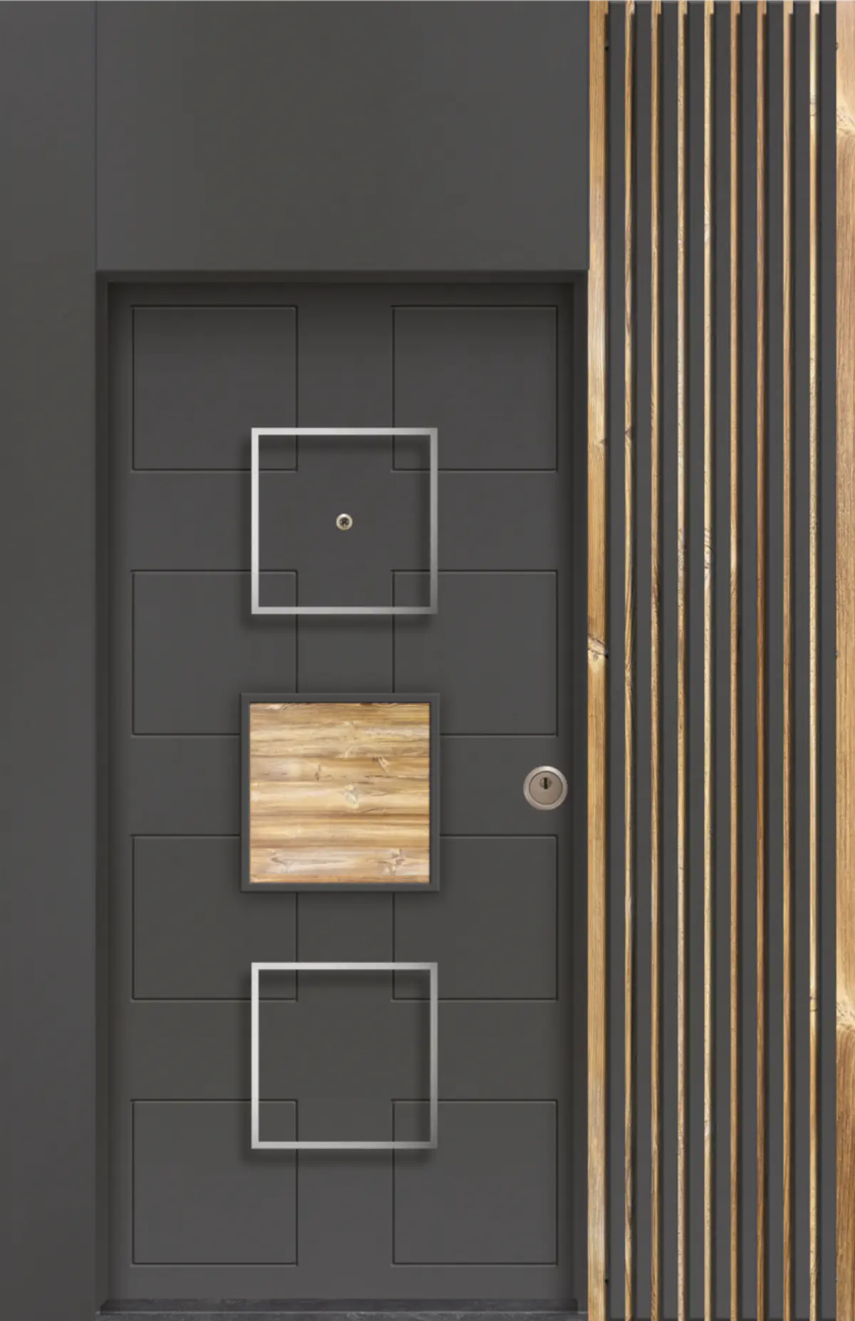 Нивел – Блиндирана Врата впечатлява с изключително модерен графичен дизайн, изграден върху изчистена матова повърхност в графитено сиво. Геометрично разположените декоративни квадрати, комбинирани с метални рамки и дървесен централен елемент, създават усещане за структурирана динамика и висока дизайнерска култура.