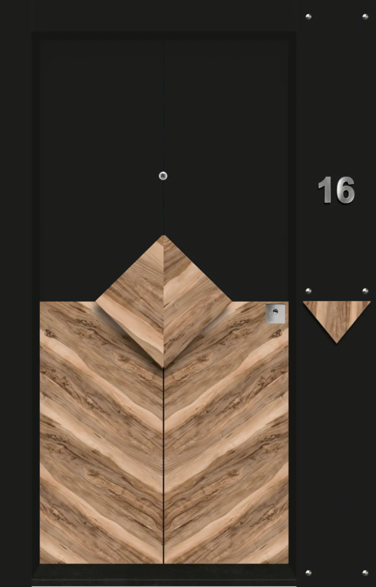 Тъмната основа придава на модела мистериозен и премиум вид, докато естествената дървесна текстура подчертава топлината и естетиката на входното пространство.