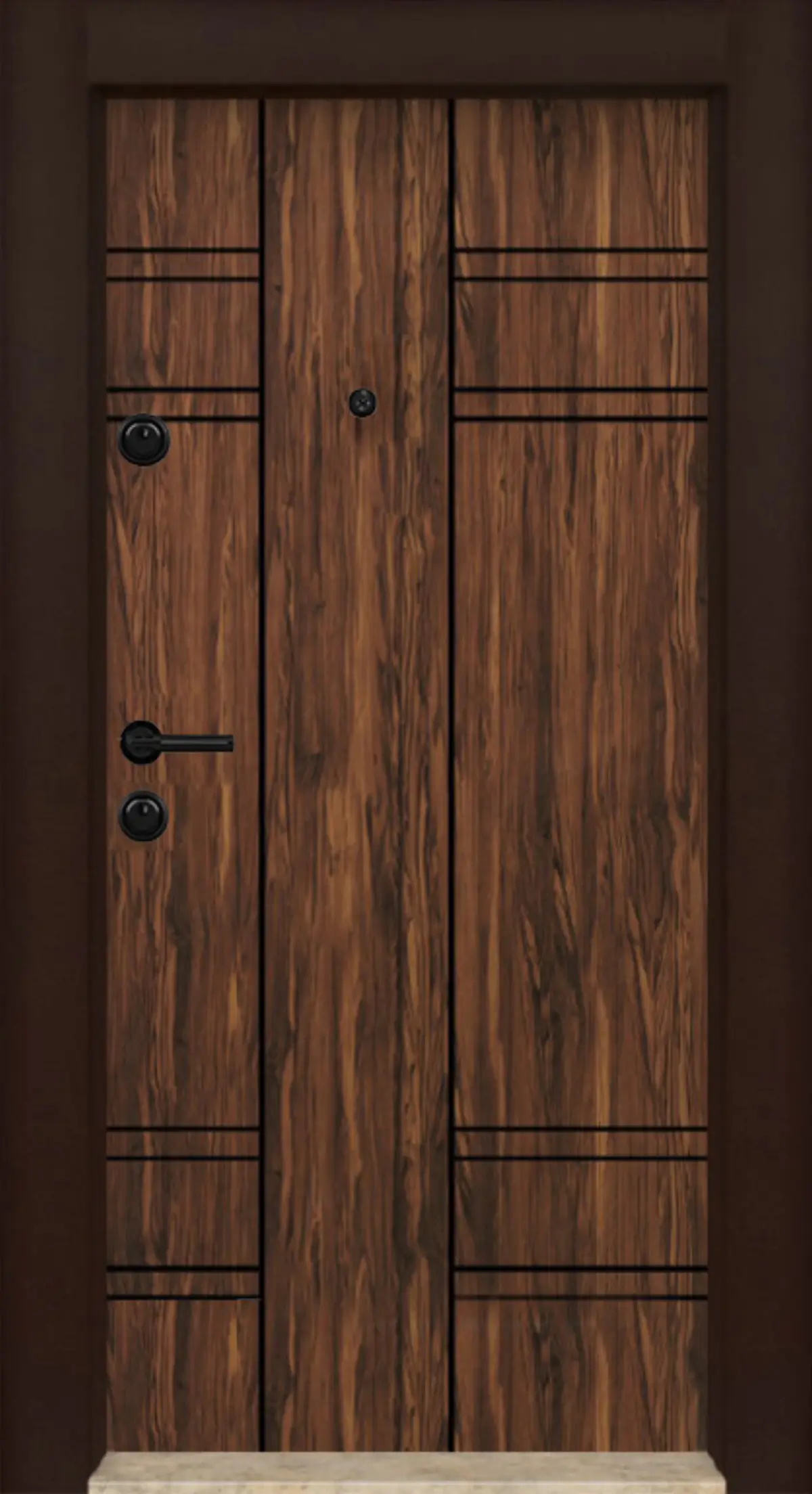 Стоманена входна врата с елегантно дървесно покритие Туна Орех и висока степен на защита. Осигурява отлична шумо- и топлоизолация, подходяща за апартаменти и различни жилищни пространства.