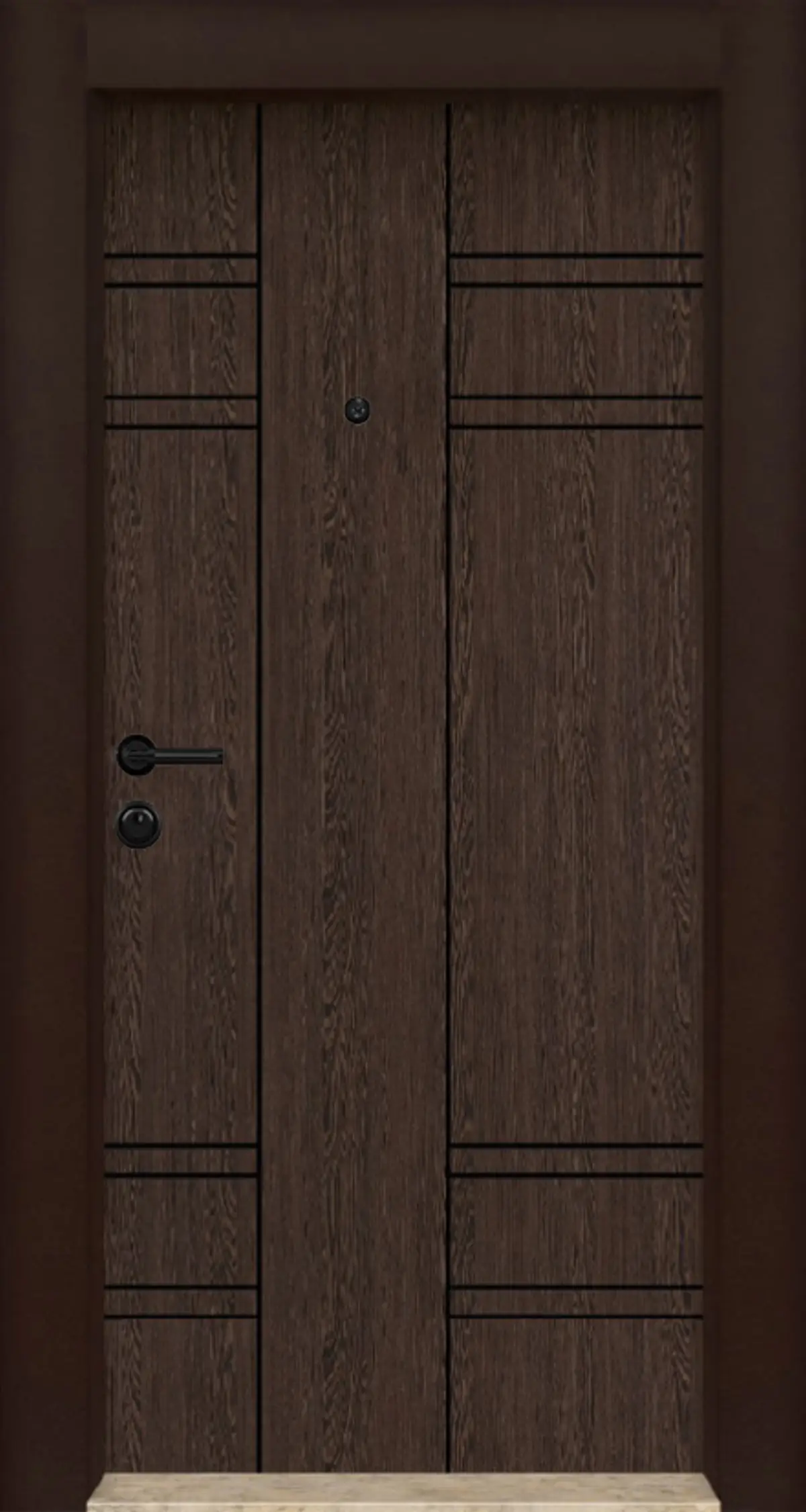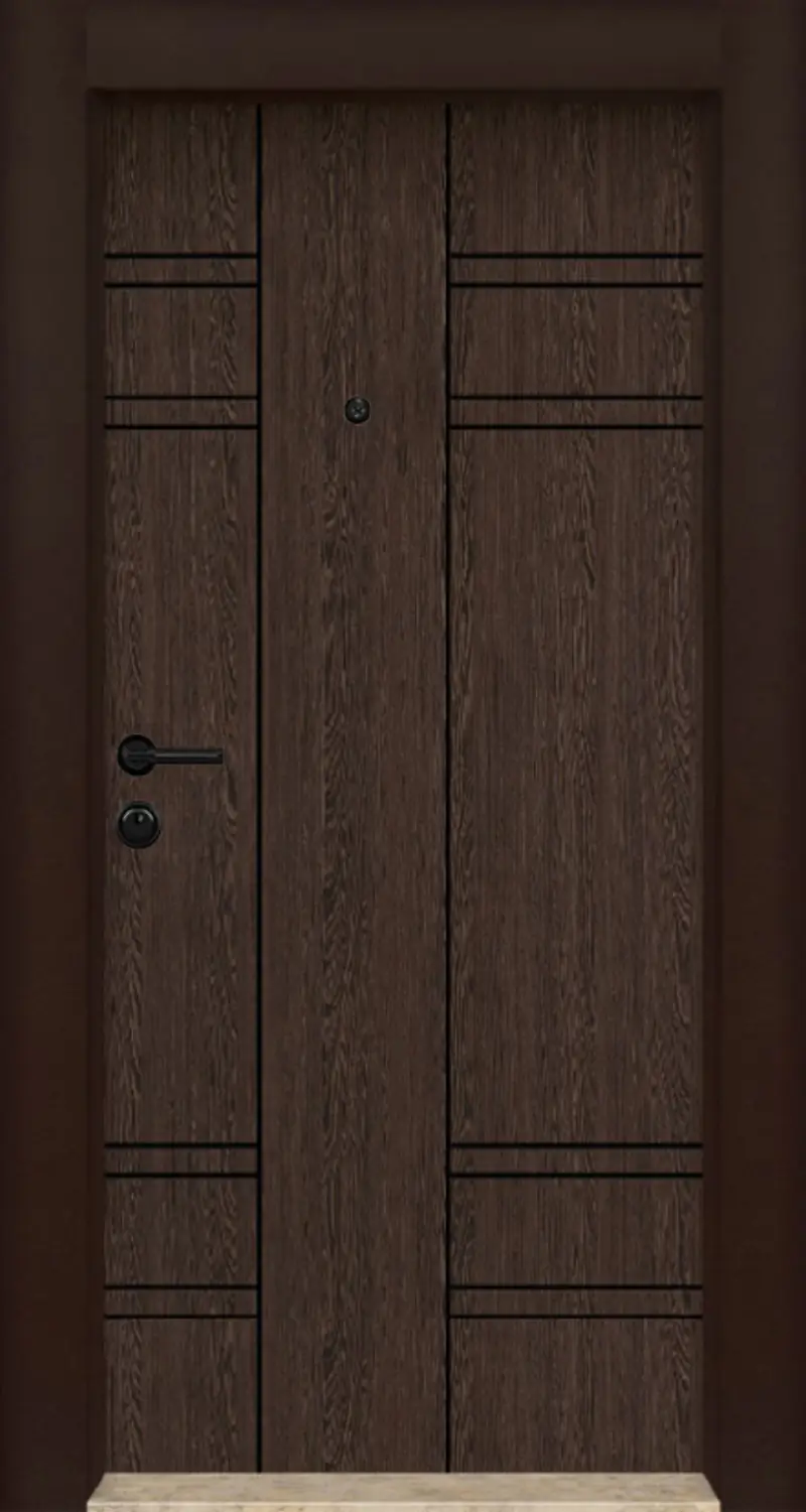 Стоманена входна врата с модерно дървесно покритие Венге и висока степен на сигурност. Осигурява шумо- и топлоизолация, подходяща за жилищни входове и съвременни интериорни решения.