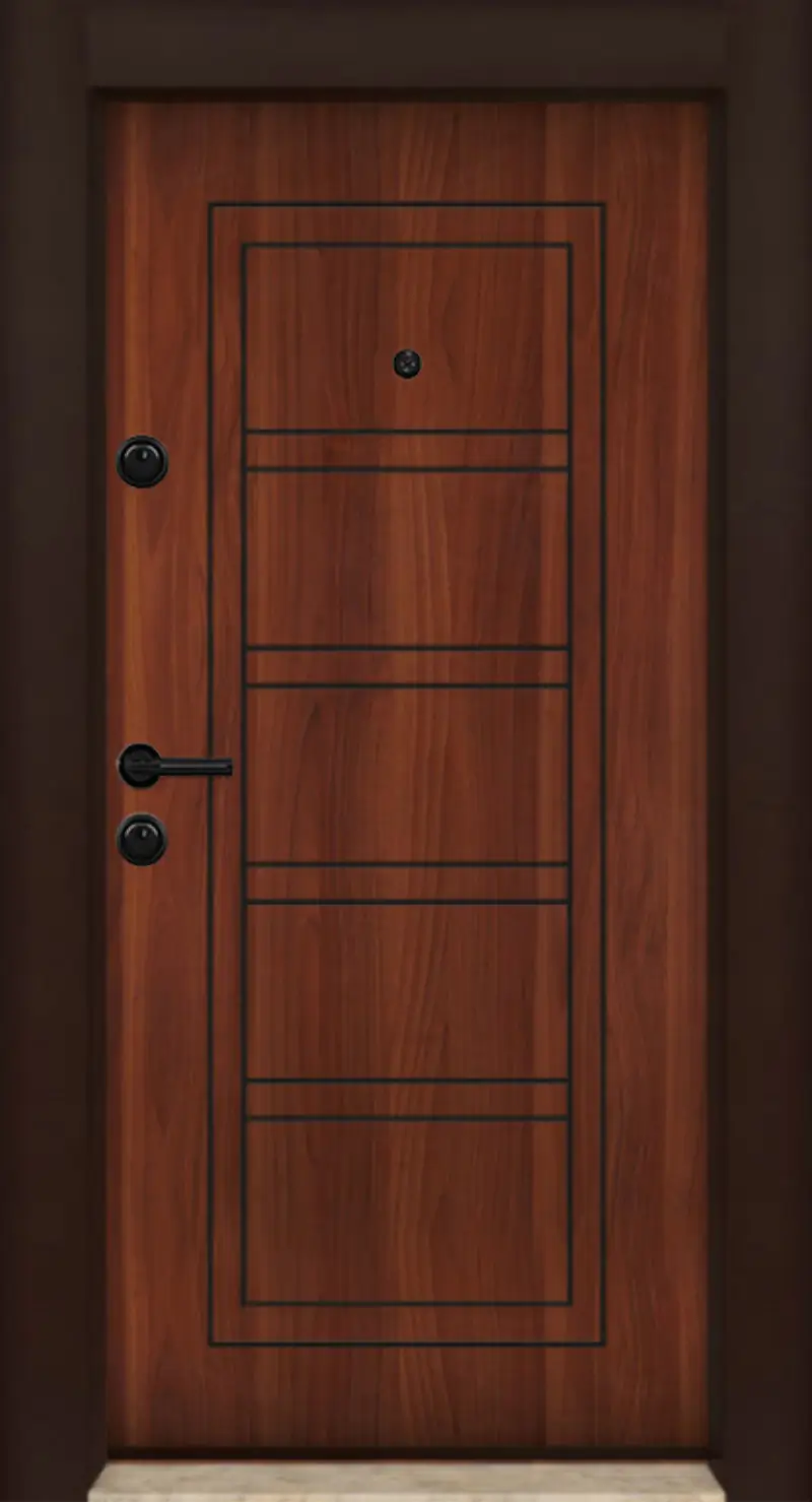 Стоманена входна врата с модерен металик орехов дизайн, висока устойчивост и подсилена защита против взлом. Подходяща за жилищни входове, като осигурява отлична изолация и стилна визия.
