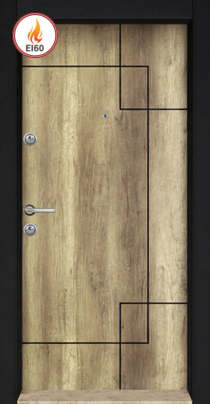 Пожароустойчивата блиндирана врата Стар 44 Светъл Отантик EI 60 впечатлява с модерния си и светъл дървесен дизайн, съчетан с висока степен на сигурност и устойчивост при пожар. Сертифицирана за 60 минути пожароустойчивост, тя осигурява надеждна защита както отвън, така и отвътре.