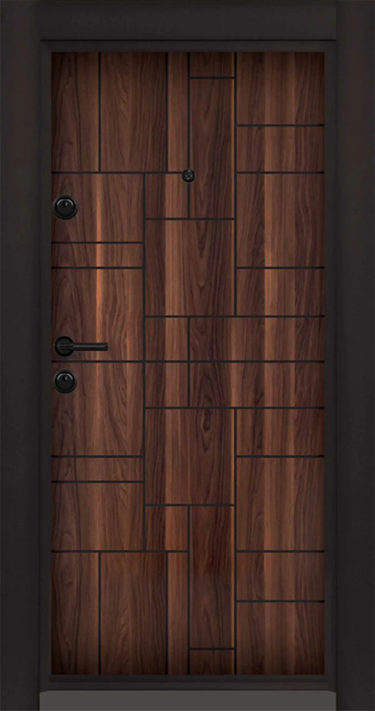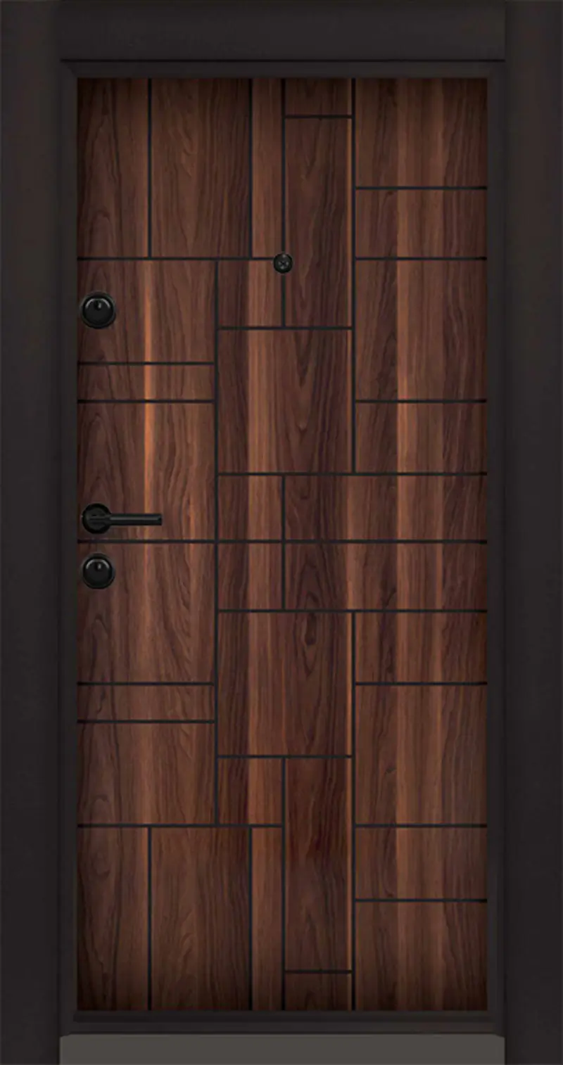 Стоманена входна врата с модерен дървесен декор „Хаска Хасър“, осигуряваща висока степен на сигурност, шумо- и топлоизолация. Отличен избор за стилни жилищни входове.