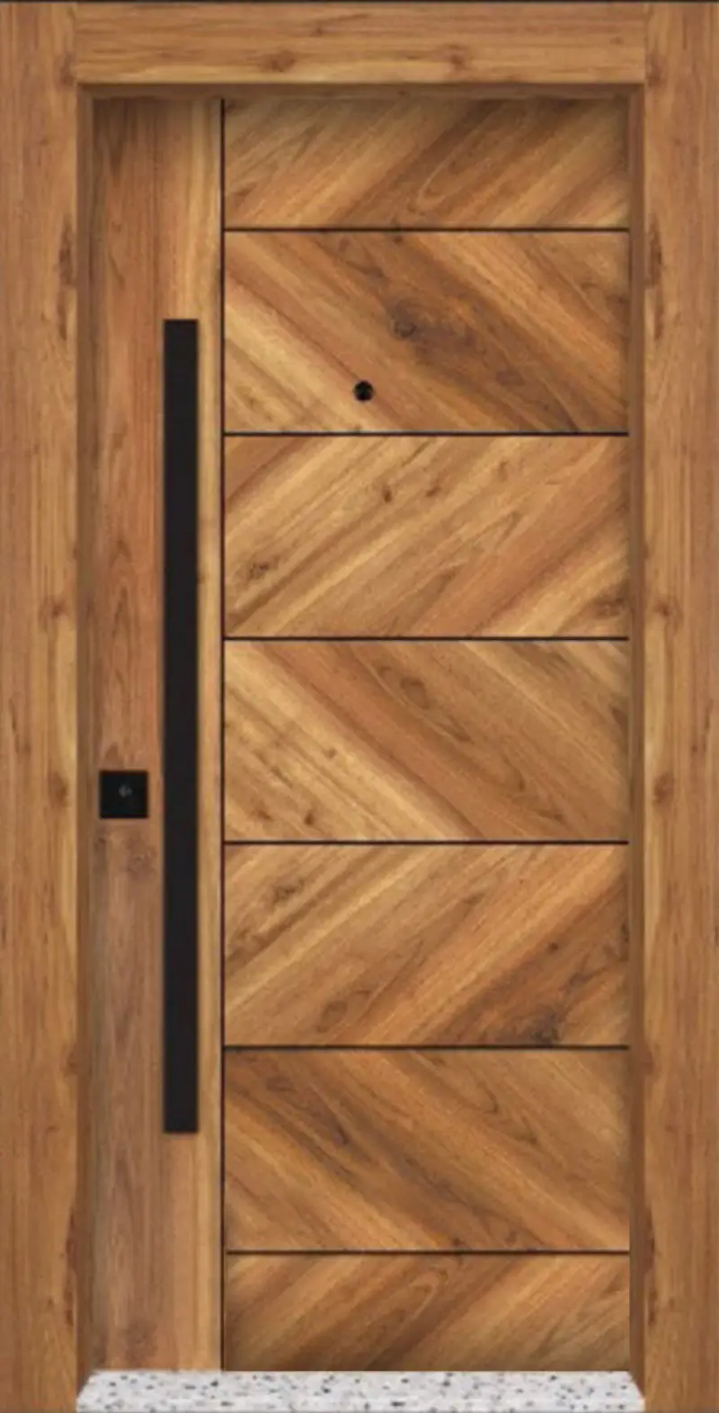 Стоманена входна врата със стилно дървесно покритие тип Сарухан, подсилена конструкция и висока защита против взлом. Осигурява отлична шумо- и топлоизолация, подходяща за жилищни входове с класическа и топла визия.