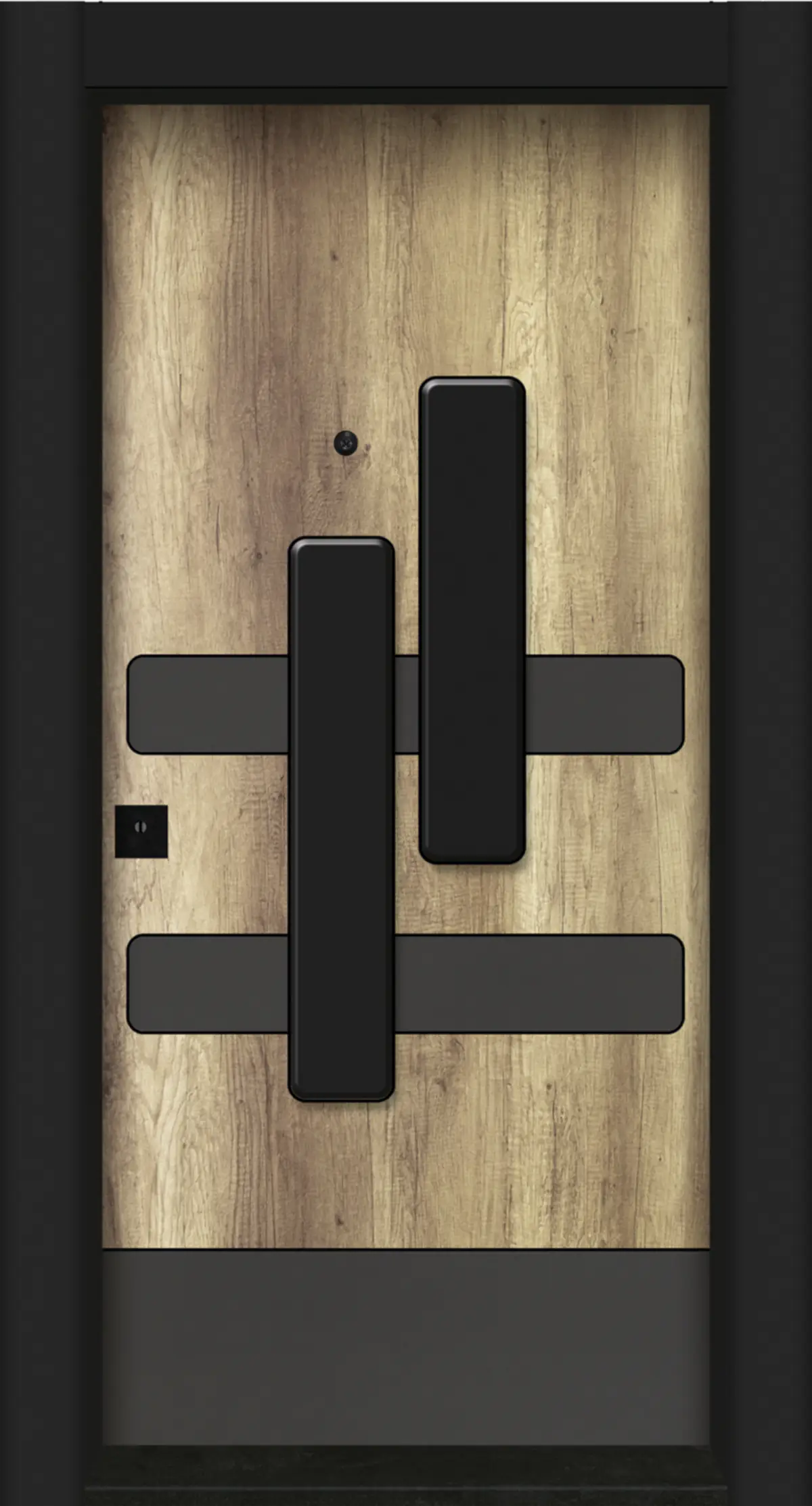 Тетра – Блиндирана Врата се откроява със своя смел дизайнерски подход и модерен баланс между дървесна текстура и графитено-черни геометрични панели. Името Тетра напълно отговаря на четирите хоризонтални декоративни елемента, които оформят силен визуален ритъм и съвременна архитектурна линия.